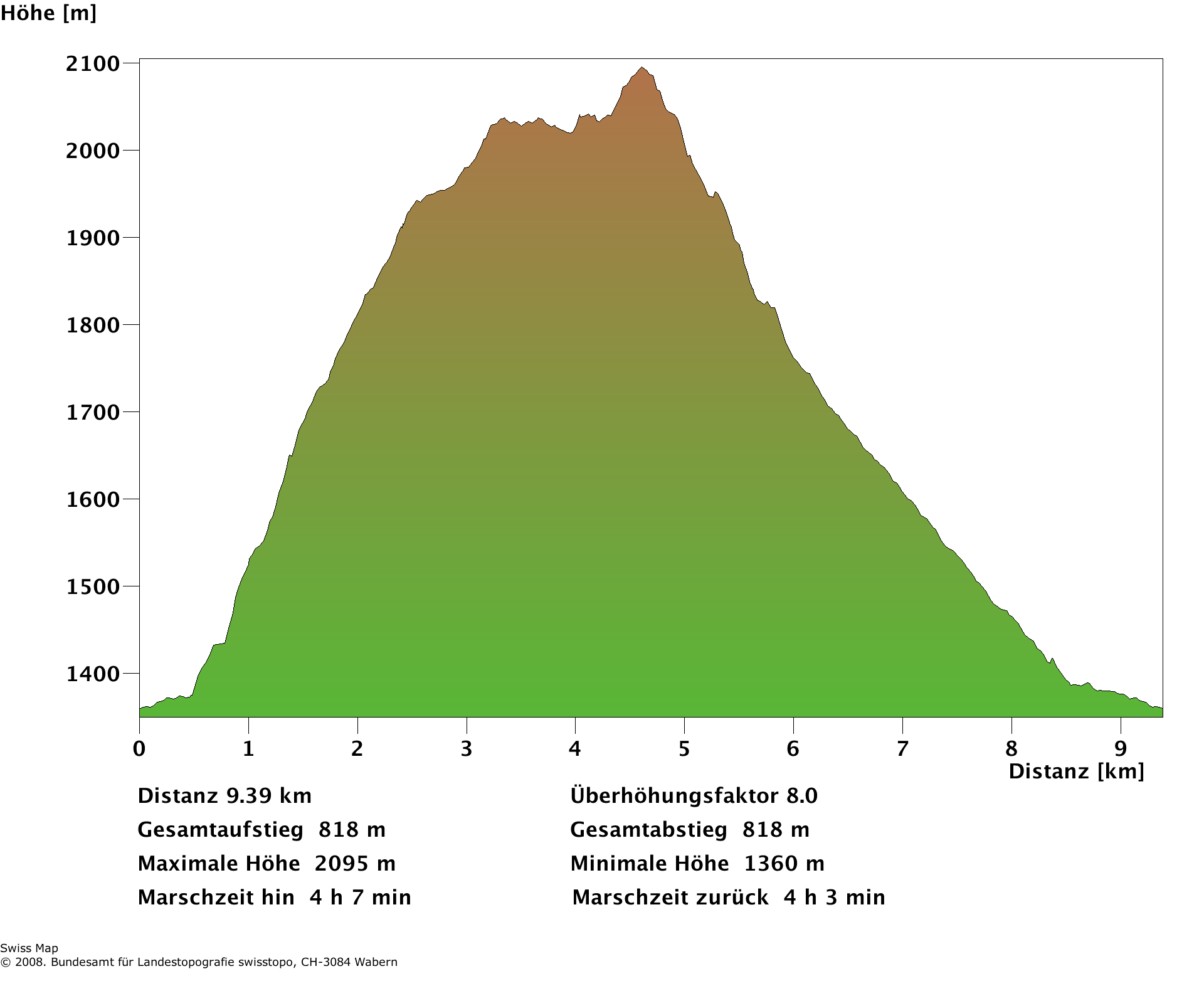 Wegpunkte: Bergstation Seilbahn Arnisee (1360m) - Arnisee (1370m) - Sunniggrathütte (1978m) - Sunnig Grat (2034m) - Langchälengrätli (2095m) - Bidemli (1654m) - Chäserli (1479m) - Arnisee (1370m) - Bergstation Seilbahn Arnisee (1360m).