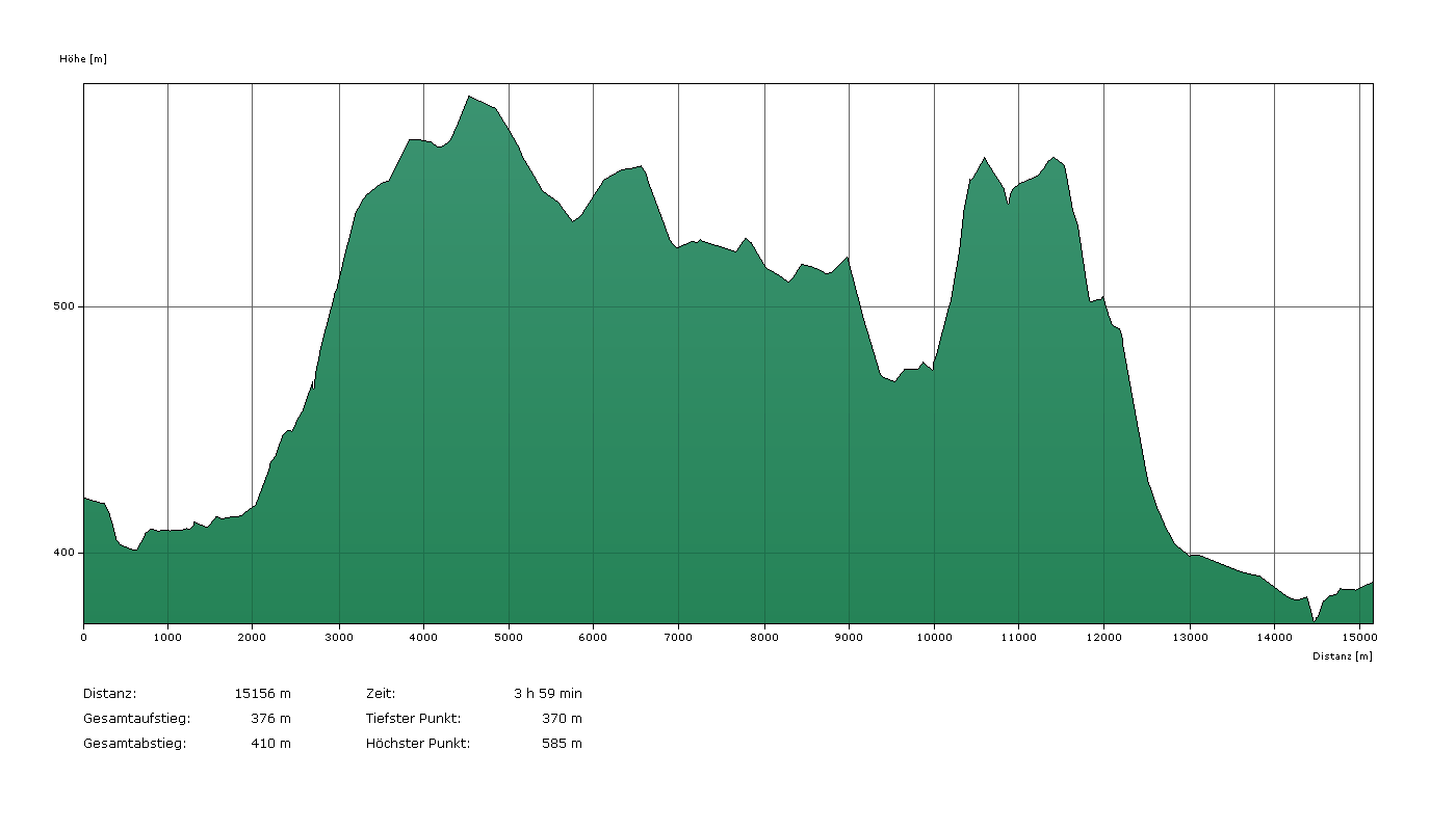 Bhf Embrach-Rorbas (423m) - Embrach Unterdorf (410m) - Heidegg (568m) - Eschenmosen (561m) - Aussichtsturm Petersboden - Wagenbrechi (462m) - Rhinsberg (567m) - Seglingen (370m) - Eglisau Bhf (389m).